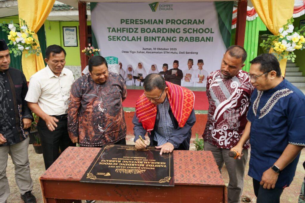 Ketua Pengurus Yayasan Dompet Dhuafa Republika, Ahmad Juwaini, meresmikan Tahfidz Boarding School Sekolah Bintang Rabbani yang berlokasi di Desa Rumah Sumbul, Kecamatan STM Hulu, Kabupaten Deli Serdang, Jumat (10/10).